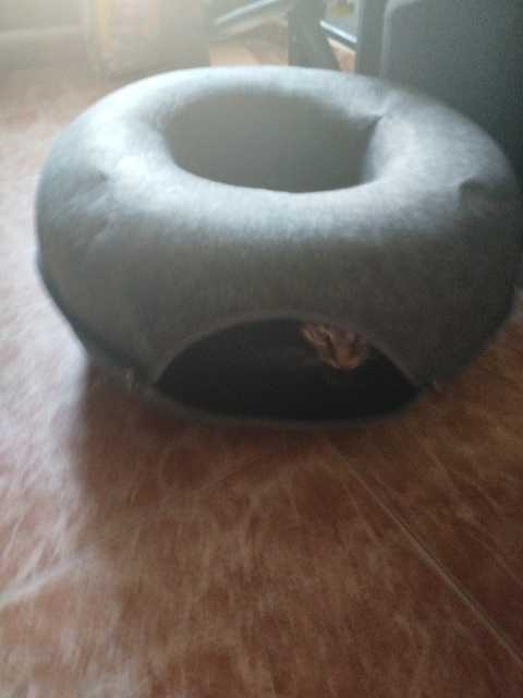 Great quality! I saw commercial on the internet and didn’t want to pay $80 . This product is exactly the same. I received it in less than 2 weeks, so quick. Great sturdy quality. We have 5 cats and only 3 play in it. I got xl i believe and it’s perfect for them as they are different sizes and ages. There weee few wrinkles from being folded but doesn’t affect quality or integrity of the donut. Highly recommend the seller and the product.